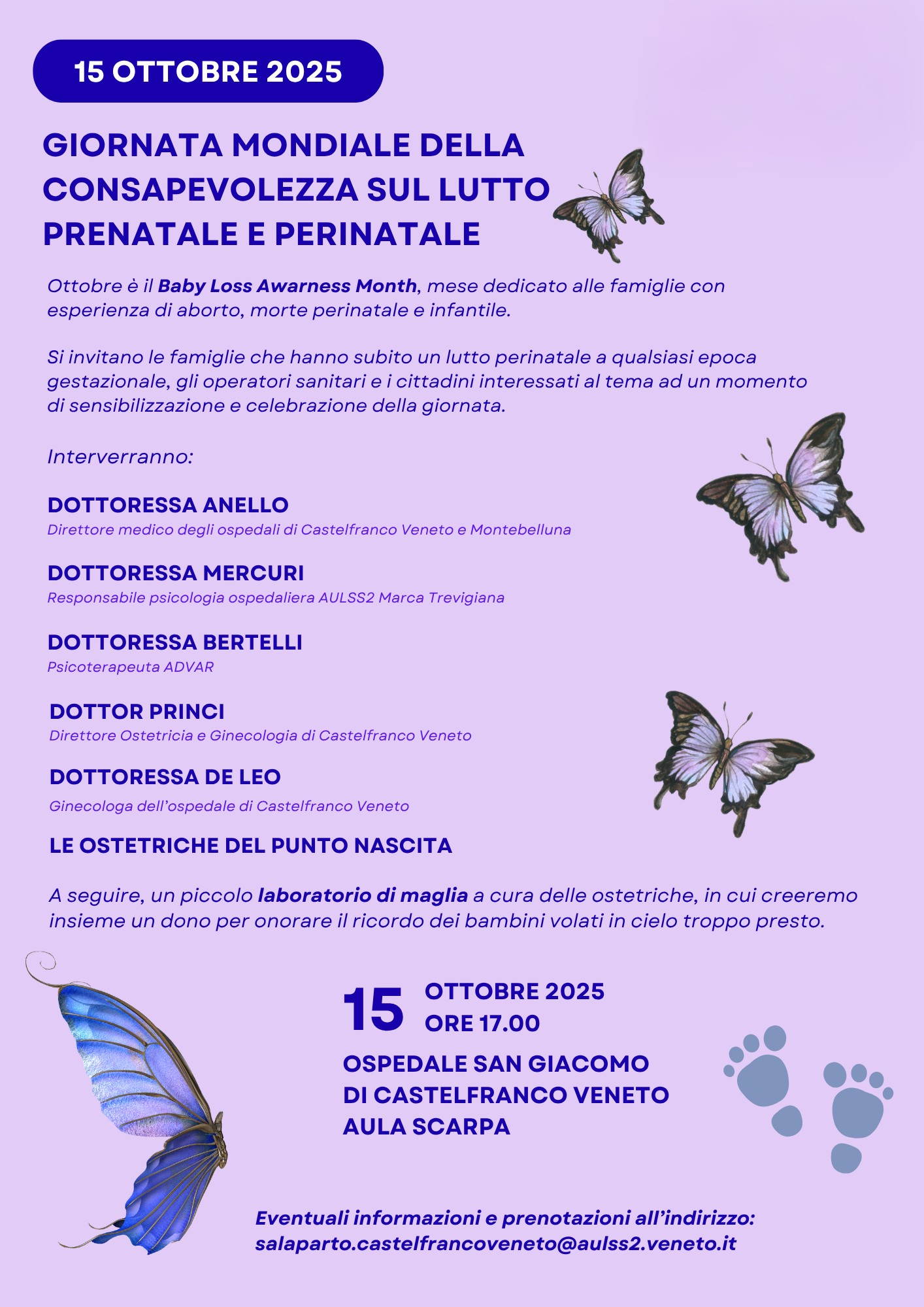 Un altro appuntamento è previsto alle ore 17.00 presso l’Aula Scarpa dell’ospedale San Giacomo di Castelfranco Veneto, dove si terrà un incontro di sensibilizzazione e confronto dedicato al tema. Durante l’evento interverranno professionisti dell'area materno infantile.