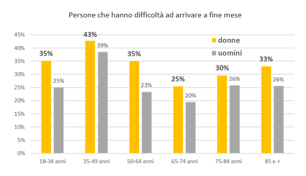 La sicurezza economica costituisce un prerequisito fondamentale per la salute, e le disuguaglianze di reddito producono effetti concreti e misurabili sul benessere delle persone. I dati lo confermano: il 42% delle donne dichiara uno stato di salute non buono, a fronte del 30% degli uomini. I sintomi depressivi risultano più frequenti tra le donne (11%) rispetto agli uomini (7%), e le donne che riferiscono almeno 14 giorni al mese di cattiva salute psicologica sono il doppio degli uomini (15% contro 8%).