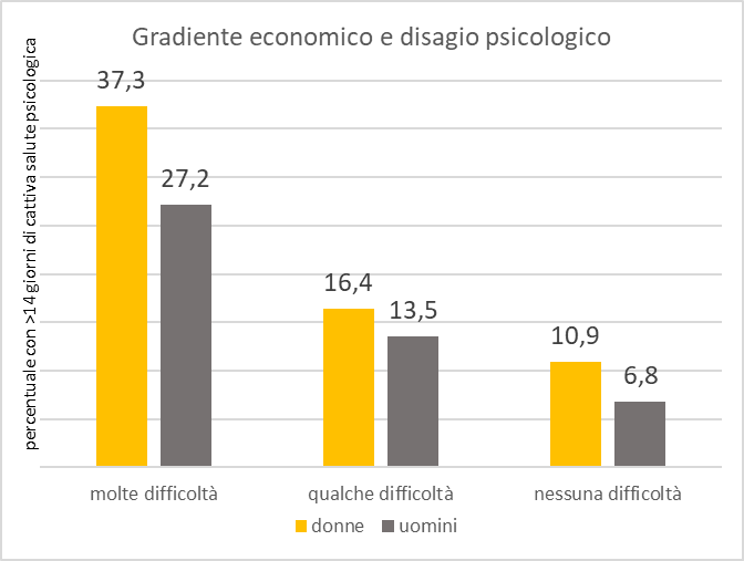 Il legame tra fragilità economica e salute psicologica è particolarmente marcato: tra le donne con gravi difficoltà economiche, oltre una su tre (37%) riferisce almeno due settimane al mese di malessere psicologico, contro circa una su dieci (11%) tra coloro che non presentano problemi di natura economica. Negli uomini, le medesime percentuali si attestano rispettivamente al 27% e al 7%.