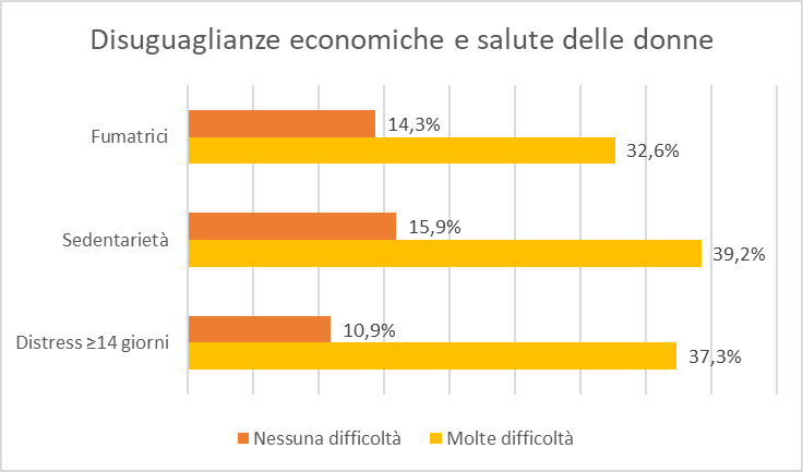 Le disuguaglianze economiche si riflettono anche sui comportamenti e sugli stili di vita. Tra le donne adulte residenti nel territorio, il 14% presenta obesità, il 18% è sedentario e il 22% è fumatrice. Tali percentuali aumentano significativamente in presenza di difficoltà economiche: rispettivamente 21% (obesità), 39% (sedentarietà) e 33% (fumo).
