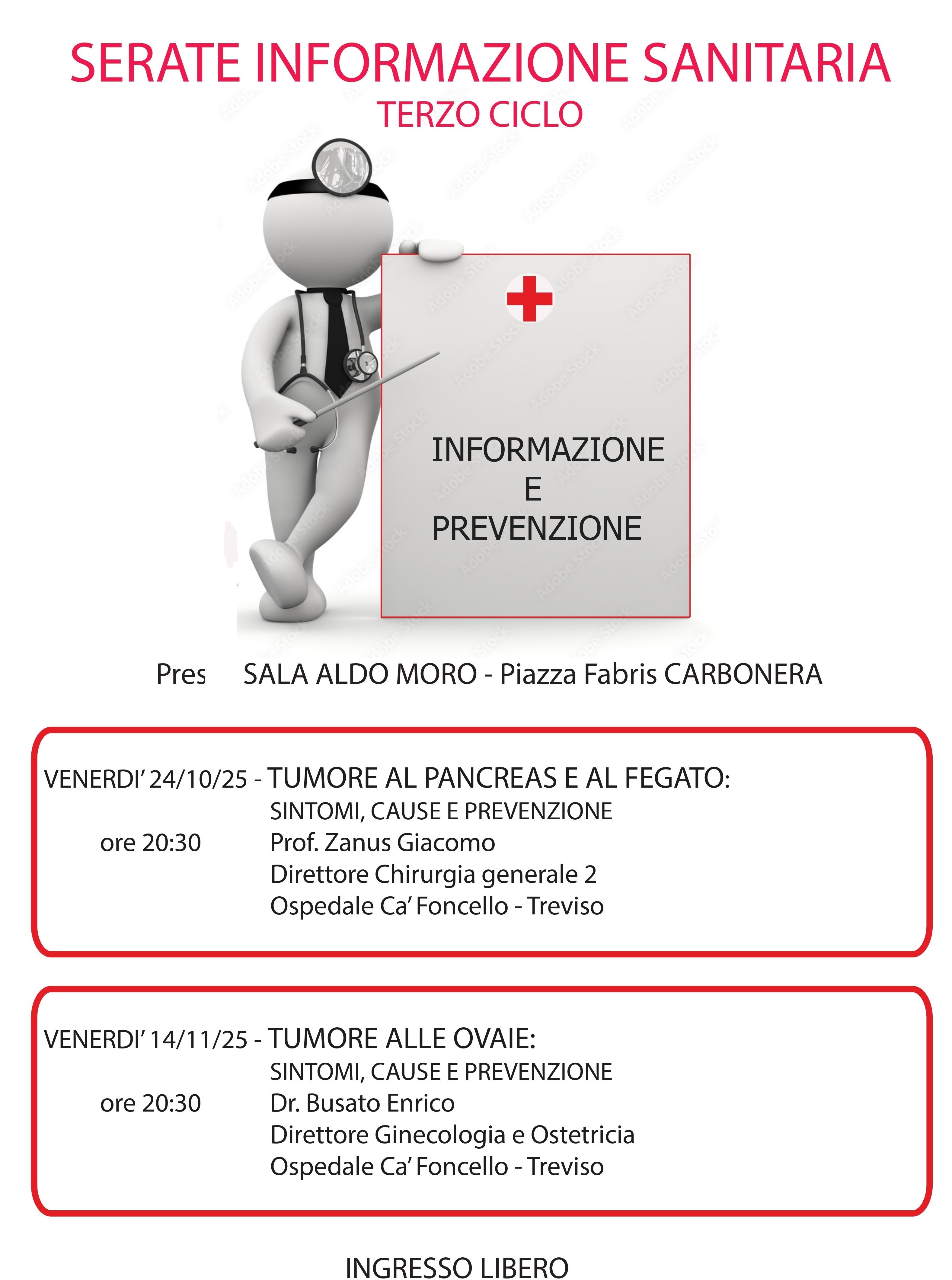 - Venerdì 14 novembre, alle ore 20.30, sarà la volta del Direttore dell'Ostetricia e Ginecologia dell'ospedale di Treviso che affronterà il tema "Tumore alle ovaie:sintomi cause e prevenzione".