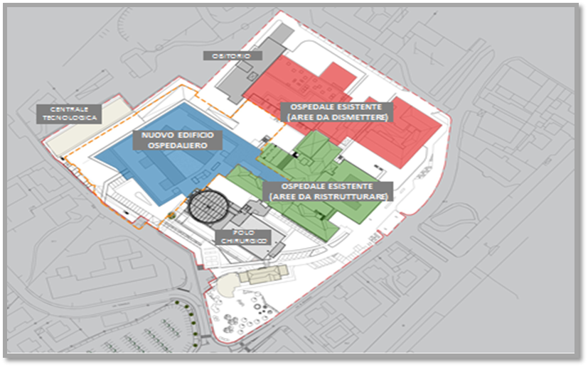 Il cantiere del nuovo complesso, che ha visto la posa della prima pietra il 2 settembre 2023, è situato nell’area a nord-ovest del Polo Chirurgico, per permettere all’edificio di essere, una volta ultimato, completamente integrato con il sistema ospedaliero esistente e con il territorio.
