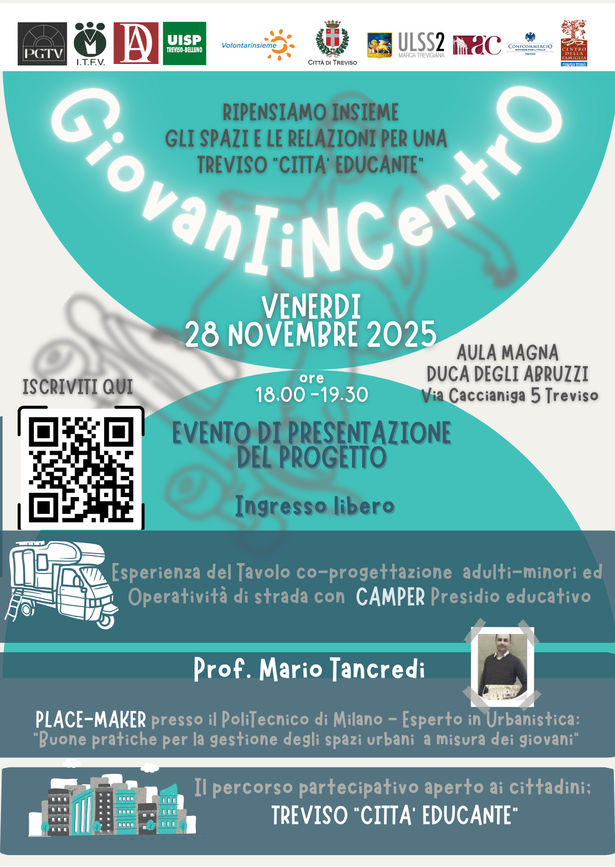 L'evento sarà la presentazione del progetto e il lancio della fase successiva. Tra le esperienze verranno presentate: quella del tavolo di co-progettazione adulti-minori, l'operatività di strada con il camper come presidio educativo in zone di degrado ed il documento (in fase di redazione) Treviso Città Educante.