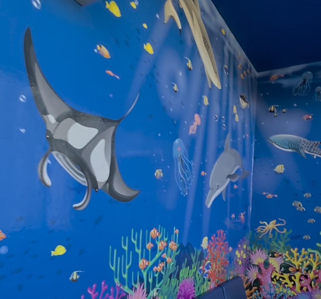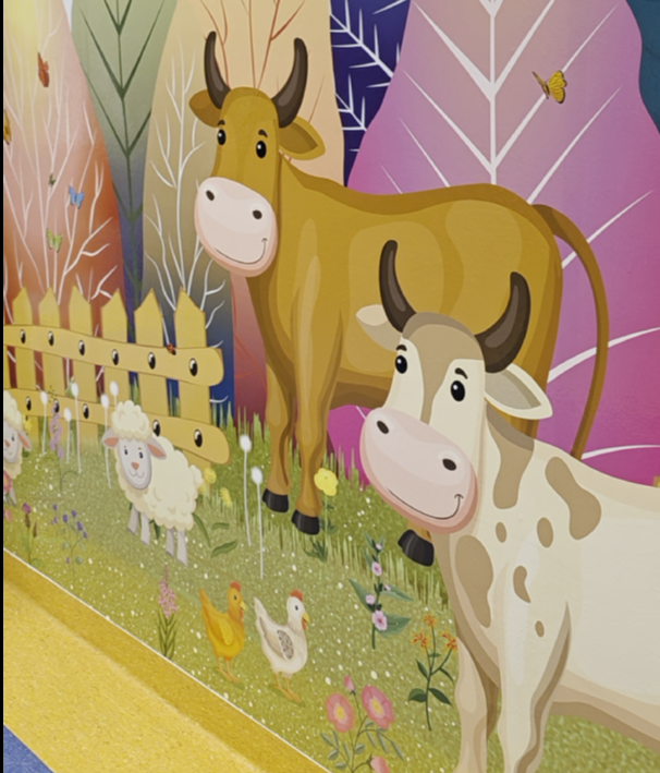 Le nuove grafiche murarie, realizzate nell’ambito del progetto di riqualificazione “Accoglienza”, trasformano gli spazi di cura in luoghi capaci di parlare ai più piccoli: la sala d’attesa si apre su un fondale marino, la stanza destinata alle terapie si colora di cielo, l’ambulatorio si illumina con l’arcobaleno, la stanza di isolamento diventa una piazza e il corridoio si trasforma in un bosco popolato di animali e fiori da attraversare. Un cambiamento che va oltre l’estetica e che contribuisce concretamente al benessere emotivo dei bambini e di chi li accompagna nel percorso di cura.