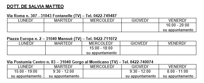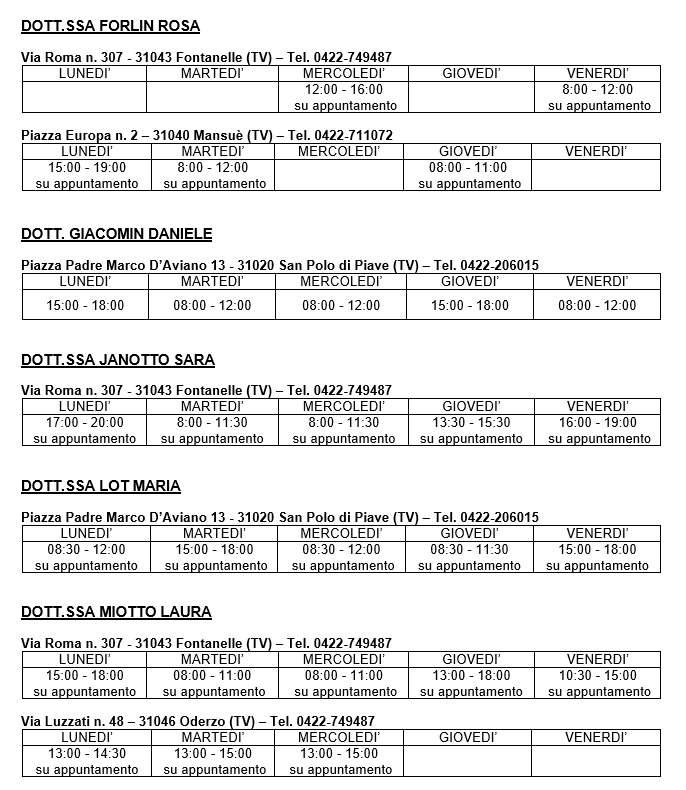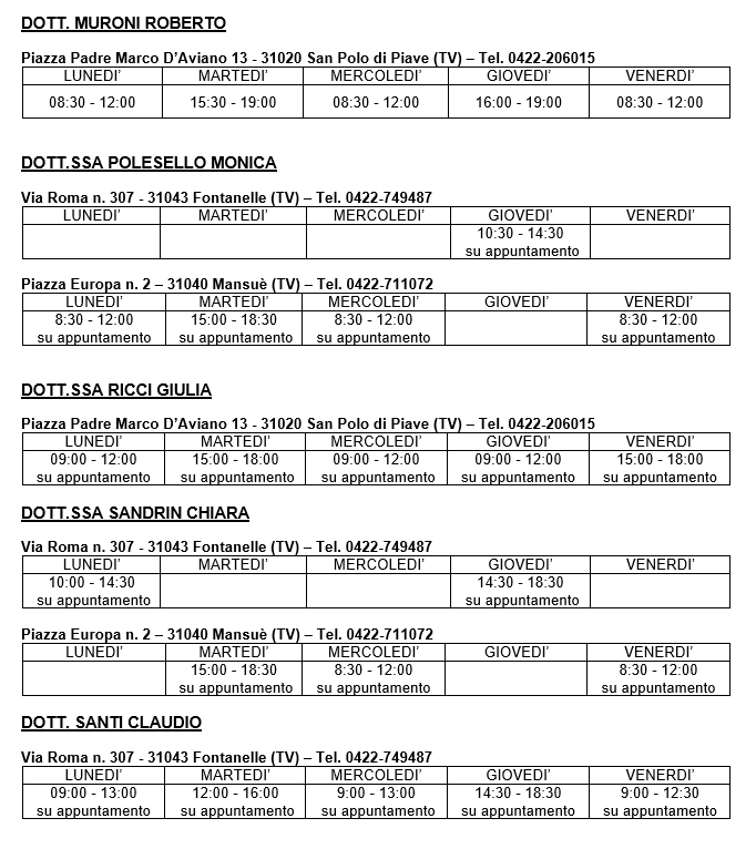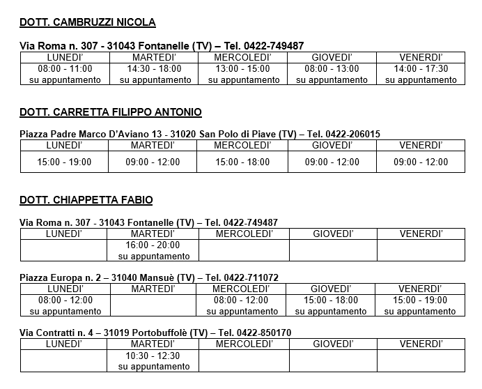 Si riportano di seguito le sedi e gli orari di ambulatorio di ciascun medico.