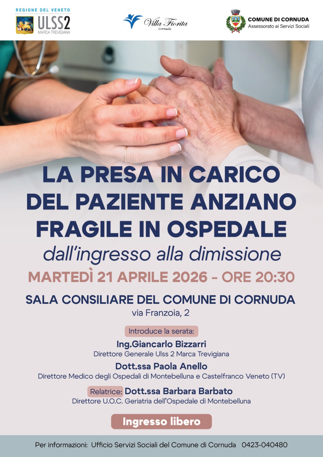 Il 21 aprile, alle 20:30, nella sala consiliare del Comune di Cornuda, si affronterà il tema "La presa in carico del paziente anziano fragile in ospedale, dall'ingresso alla dimissione".