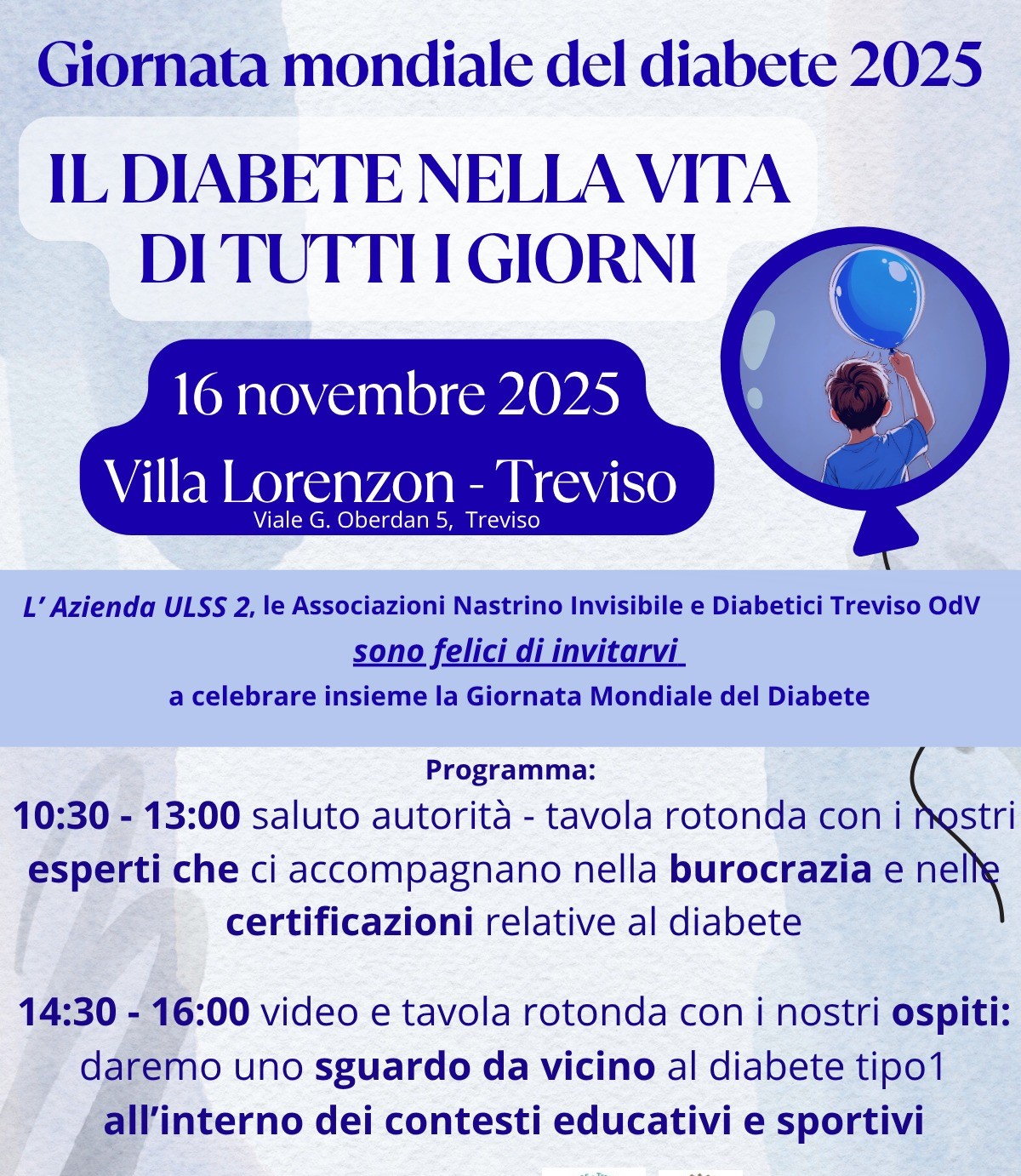 "Il diabete nella vita di tutti i giorni" è un'iniziativa ideata e promossa dall'équipe multidisciplinare di Diabetologia dell’Ulss2 (U.O. S. di Diabetologia Pediatrica, U.O.C. Malattie Endocrine del Ricambio e della Nutrizione e U.O. di Psicologia Ospedaliera), in collaborazione con l'Associazione Diabetici Treviso, l’Associazione Nastrino Invisibile e con il patrocinio del Comune di Treviso.